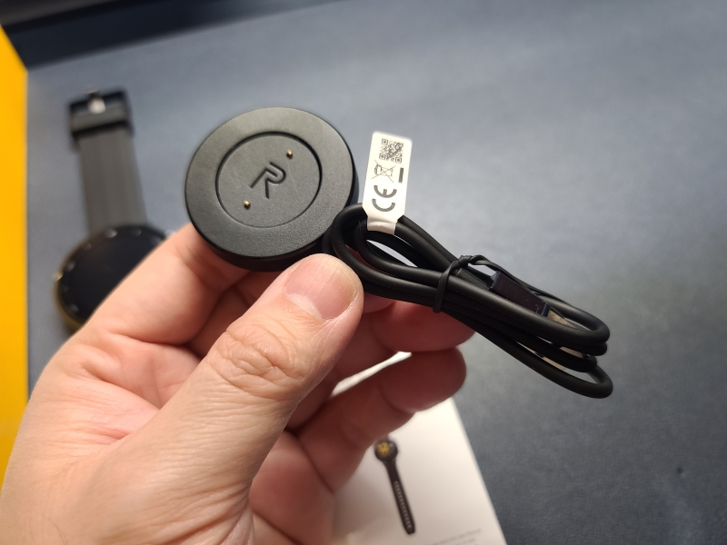 チャージャーはマグネット式。背面にはブランドロゴの[R]マークが入ります。安いスマートウォッチだと接点接続だけの簡易的なケーブルで済まされる事が多いですがしっかりロゴ入りの台座チャージャーを用意したあたりに、Realmeの本気度を感じます。