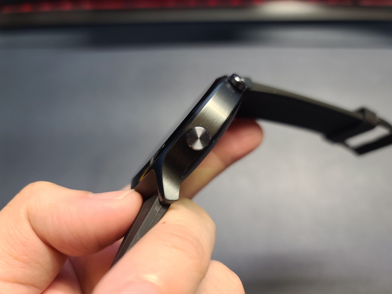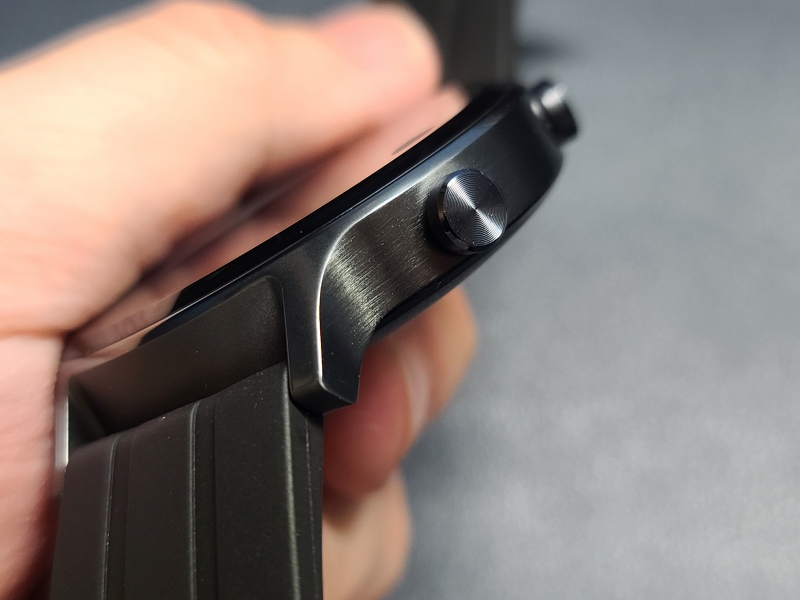 アルミのケースは、表面はツヤのある感じで、サイドはヘアライン、ラグ周りはブラストとそれぞれ処理が変えられていてデザインに立体感が出るように工夫されています。ボタンもスピン加工がされています。ケースの加工が非常に力が入っていて、同価格帯の安スマートウォッチでは絶対やらないような細かい処理が施されています。