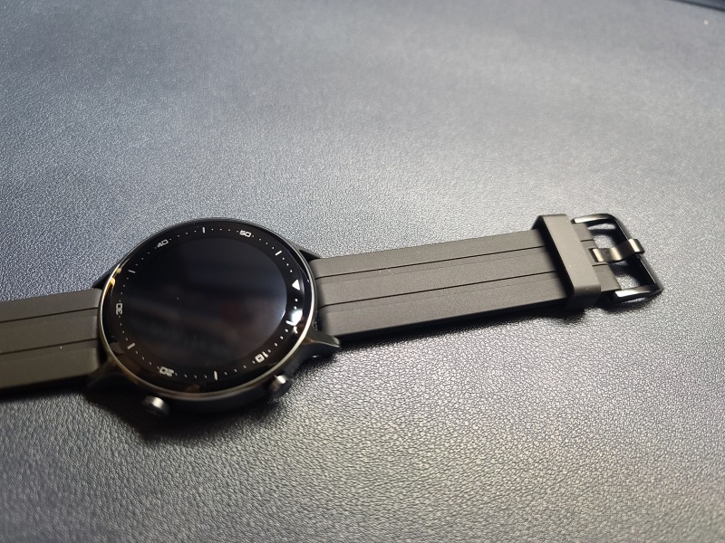 グレーのアルミが特徴なシャープなデザインです。パッと見はHuawei Watch GT2 Proにも似ています。直径47mm 厚み12mmtと中々大柄なデザインではありますが、アルミと、バックケースはプラスチックのためめちゃくちゃ軽いです。公証はストラップ込で48gです。