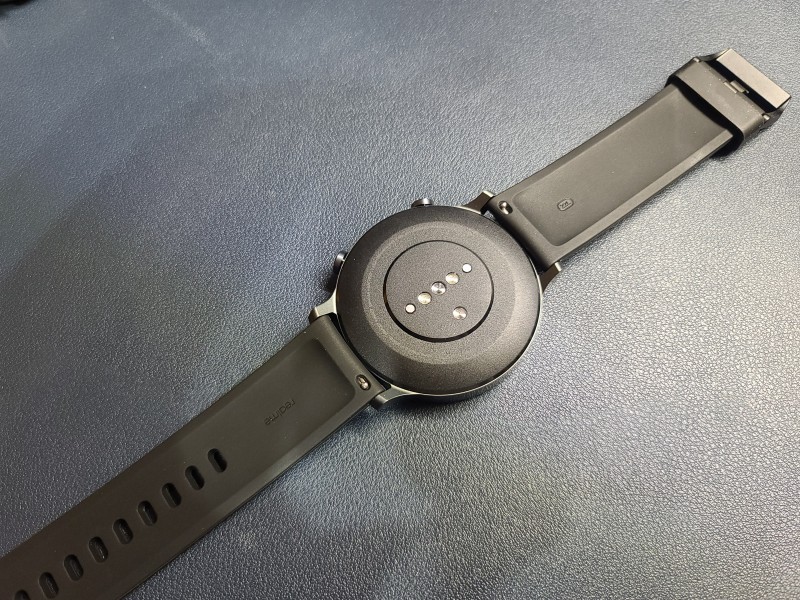 裏側はプラスチック素材。充電接点と、各種センサー類あります。公式サイトによると、一つだけずれてるのが血中酸素濃度を測るセンサーっぽいです。