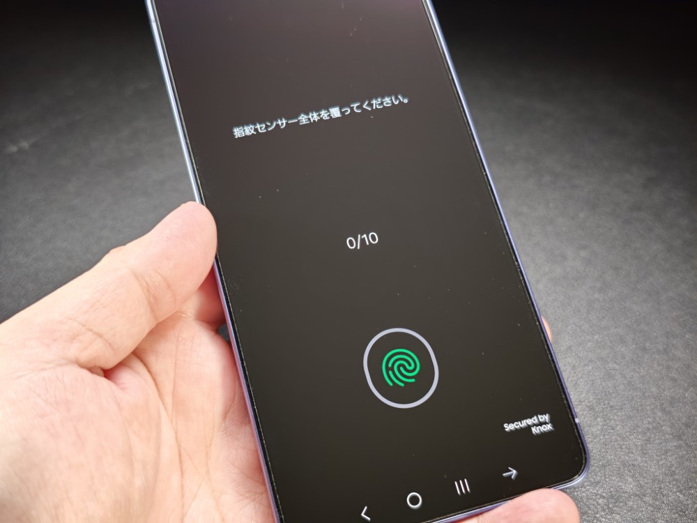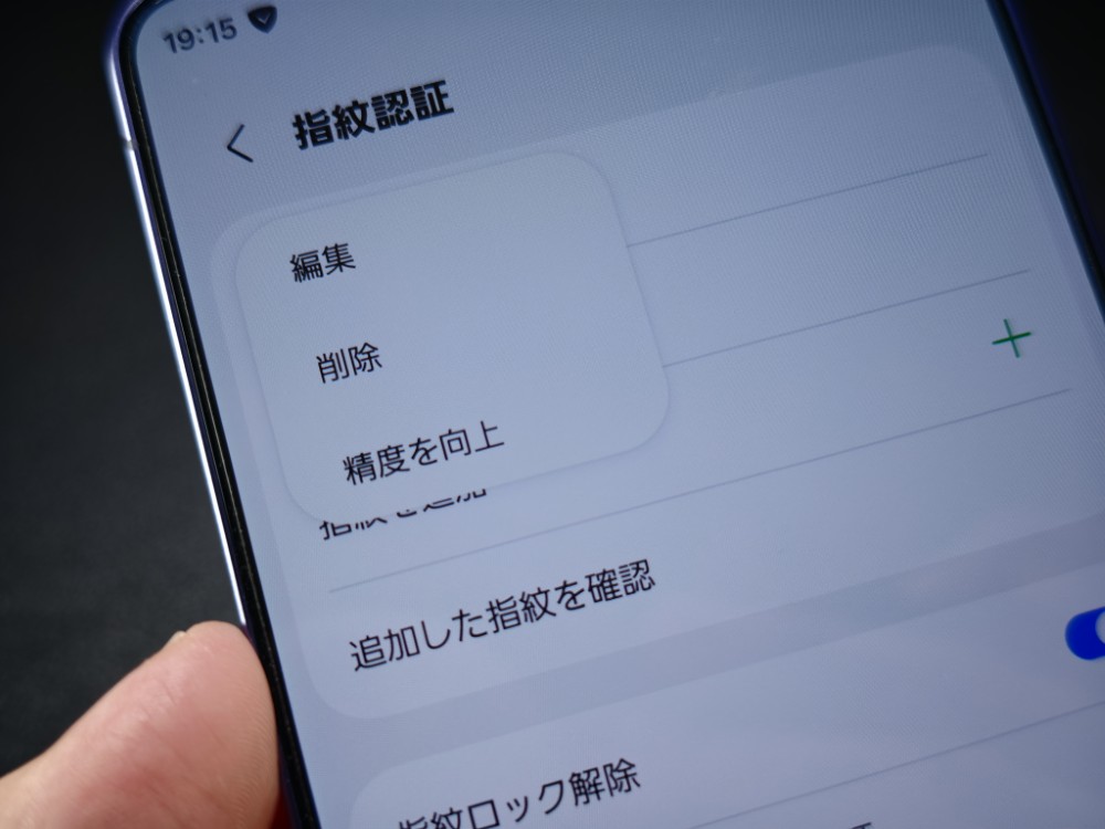 以前から指紋認証の精度を上げるために、同じ指を2回登録するのがGalaxyでは裏技的に使われてきましたが、今回新しく一つの指に対して、追加で登録し、指紋認証精度を上げる事ができるようになりました。指紋管理から「精度を向上」で追加で登録が出来ます。10回タップする事で情報を追加で登録できるようになりました。これも細かすぎる変更点ですね。