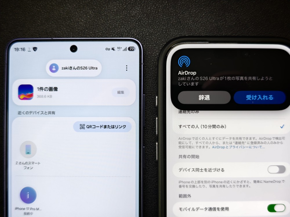 アップデート後は、クイックシェアでiPhoneなどのアップル製品と送受信が可能になります。