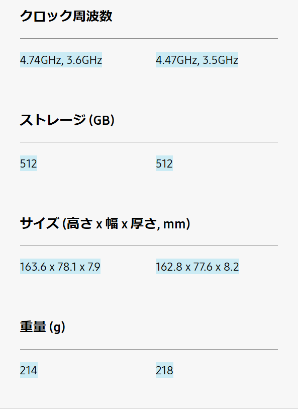 Galaxyサイトには、それぞれの機種を比較する便利な機能があるので、S26 UltraとS25 Ultraを比べてみましょう。なんと「違う所だけ表示」する事も出来るので凄く分かりやすいです。