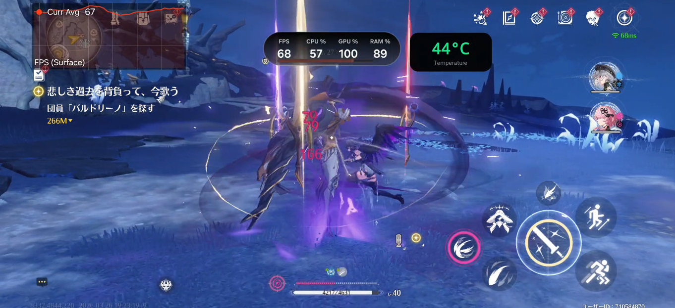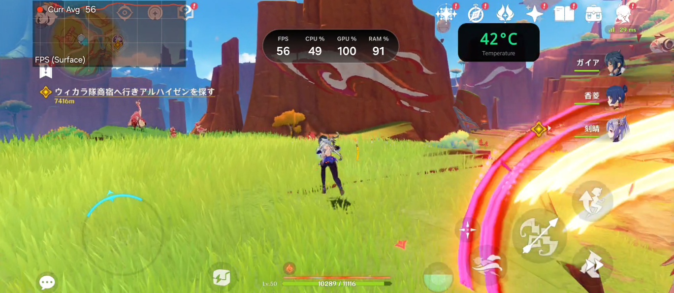お次は鳴潮です。以前より、何故かフレームブーストが有効になると実際にフレームレートが向上します。前作はすぐにスロットリングが入り、頑張って70fpsなど、基本的に60fpsに毛が生えた程度でしたが、今回のS26 Ultraでは、本体温度が低いうちは100fps以上のフレームレートが出ます。100fpsは瞬間的なことが多く、おおよそ90~70fps前後で動作をします。
